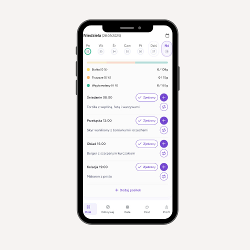 - monitorowanie – możesz podglądać ilość spożytych kalorii, makroskładników i składników mineralnych.